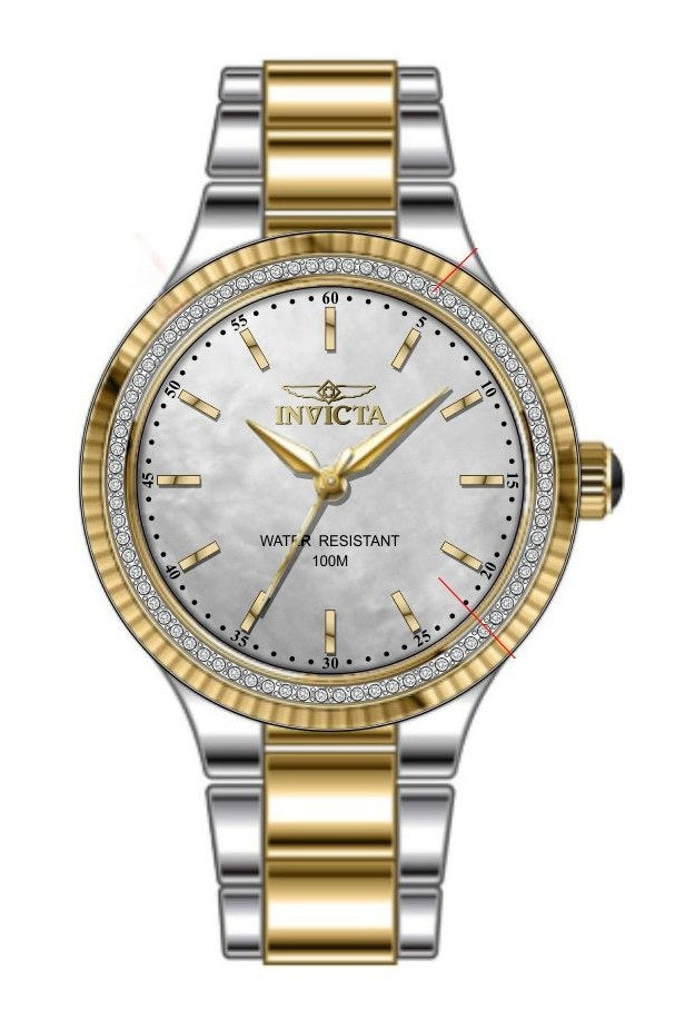 Band Material: Stainless Steel, Band Tone: Steel,Gold, Band Width: 18.5MM, Band Length: 175MM, Crown Type: Push, Case Material: Stainless Steel, Case Tone: Gold,Steel, Case Size [mm]: 38, Case Back: Solid, Material of Hands: Brass, Color of Hands: Gold, Crystal Type: Flame Fusion, Bezel Material: Stainless Steel,Crystal, Dial Material: Mother of Pearl, Dial Color: White, Dial Pattern: None .Purchasing these parts and having a non-authorized repair center open your watch voids all manufacturing warranties. Invicta cannot guarantee the quality standards of an altered timepiece, the standard 3-year limited warranty on Invicta timepieces shall be invalid if the timepiece is serviced at any time by an unauthorized repair center. This includes battery replacements, which must be done at an Invicta authorized repair center in order to maintain the eligibility of the warranty. Please follow the link below to learn more about Invicta's warranty.https://cdn.invictawatch.com/www/files/invicta-warranty-2018.pdf