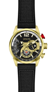 INVICTA Aviator Men 46mm Stainless Steel Gold Black dial VD53 Quartz , Band Material: Nylon, Band Tone: Black, Band Size [mm]: 24, Band Length [mm]: 190, Buckle Type: Buckle , Crown Type : Push, Case Material : Stainless Steel, Case Tone : Gold, Case Size (mm) : 46, Case Back : Solid, Material of Hands : Metal, Color of Hands : Gold,Luminous, Crystal Type : Flame Fusion, Bezel Material : Stainless Steel, Dial Material : Metal, Dial Color : Black, Dial Pattern : Textured Pattern .Purchasing these parts and having a non-authorized repair center open your watch voids all manufacturing warranties. Invicta cannot guarantee the quality standards of an altered timepiece, the standard 3-year limited warranty on Invicta timepieces shall be invalid if the timepiece is serviced at any time by an unauthorized repair center. This includes battery replacements, which must be done at an Invicta authorized repair center in order to maintain the eligibility of the warranty. Please follow the link below to learn more about Invicta's warranty.https://cdn.invictawatch.com/www/files/invicta-warranty-2018.pdf