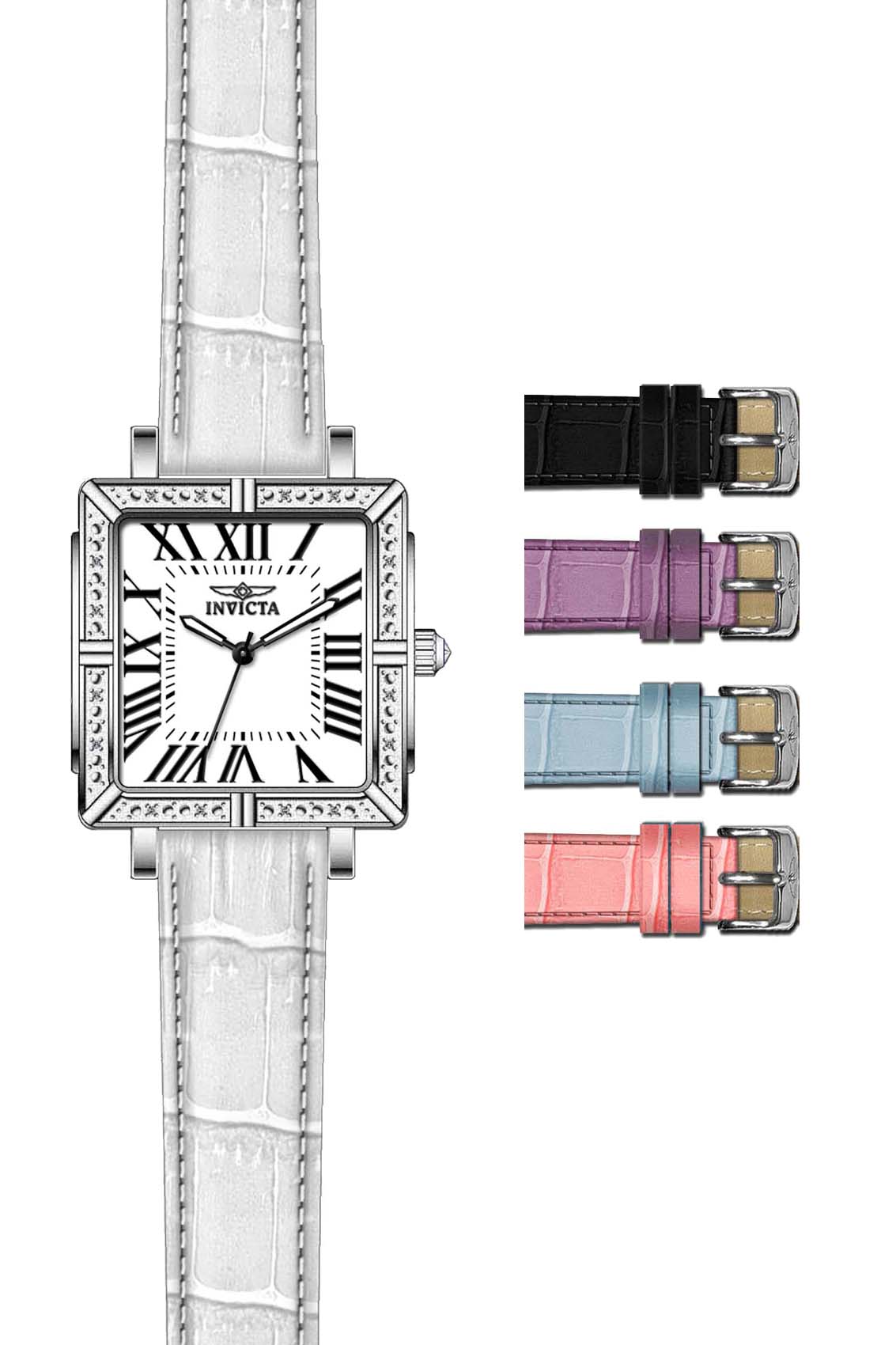 Band For Lady Invicta Wildflower 12410, Band Material Leather, Band Color White, Black, Purple, Blue, Pink. Band Width 16 MM, Band Length 223 MM, Buckle Type Regular, Clasp Type Regular. Please note that bands do not ship with spring bars or T bars. If you need these parts, please add them to your cart with the corresponding part sku.