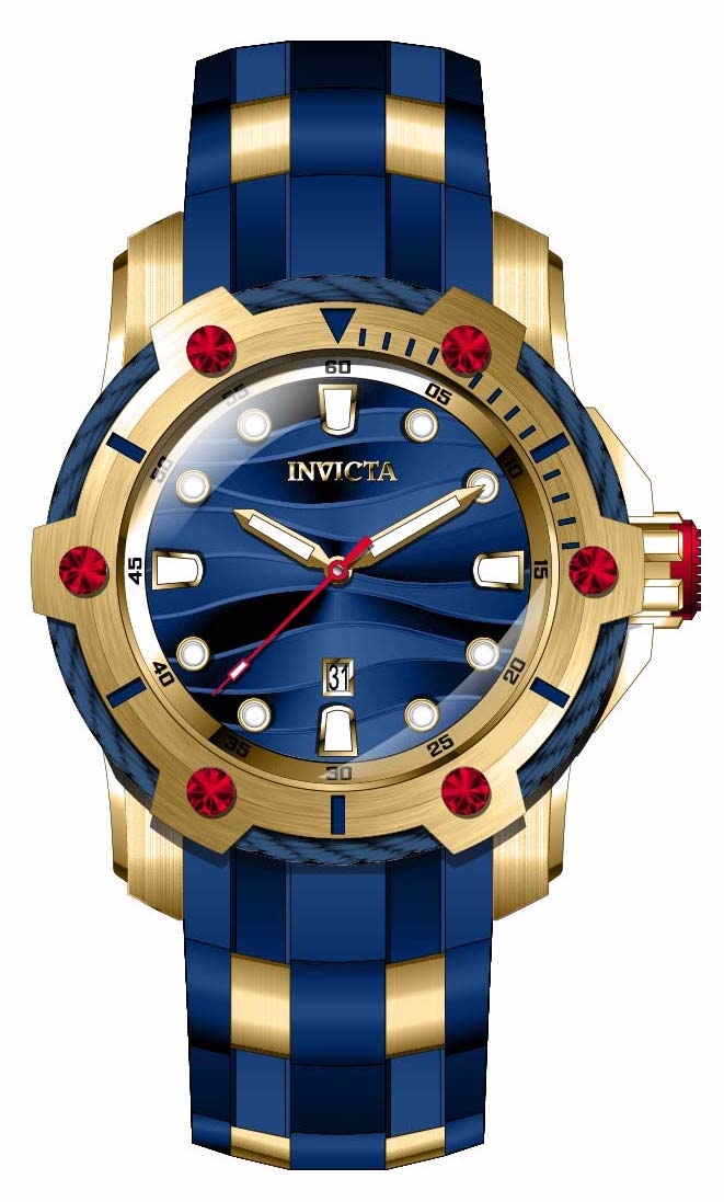 Band Material: Stainless Steel,Silicone, Band Tone: Gold,Blue, Band Width: 22MM, Band Length: 189MM, Crown Type: Push, Case Material: Stainless Steel, Case Tone: Gold, Case Size [mm]: 39.5, Case Back: Solid, Material of Hands: Metal, Color of Hands: Red,Gold, Crystal Type: Flame Fusion, Bezel Material: Stainless Steel,Cable, Dial Material: Metal, Dial Color: Blue, Dial Pattern: Textured Pattern .Purchasing these parts and having a non-authorized repair center open your watch voids all manufacturing warranties. Invicta cannot guarantee the quality standards of an altered timepiece, the standard 3-year limited warranty on Invicta timepieces shall be invalid if the timepiece is serviced at any time by an unauthorized repair center. This includes battery replacements, which must be done at an Invicta authorized repair center in order to maintain the eligibility of the warranty. Please follow the link below to learn more about Invicta's warranty.https://cdn.invictawatch.com/www/files/invicta-warranty-2018.pdf