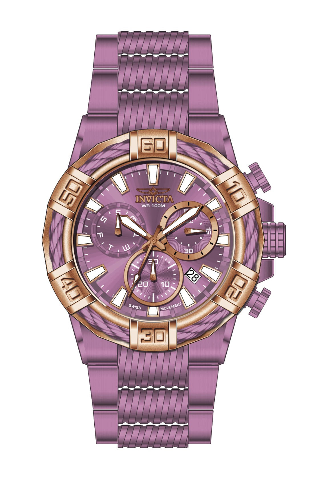 INVICTA Bolt Men 51mm Stainless Steel Light Purple Light Purple dial Z60 Quartz , Band Material: Stainless Steel, Band Tone: Light Purple, Band Size [mm]: 30, Band Length [mm]: 190, Buckle Type: Fold over safety , Crown Type : Push, Case Material : Stainless Steel, Case Tone : Light Purple, Case Size (mm) : 51, Case Back : Solid, Material of Hands : Metal, Color of Hands : Rose Gold, Crystal Type : Flame Fusion, Bezel Material : Stainless Steel,Cable, Dial Material : Metal, Dial Color : Light Purple, Dial Pattern : Sun-ray Finish .Purchasing these parts and having a non-authorized repair center open your watch voids all manufacturing warranties. Invicta cannot guarantee the quality standards of an altered timepiece, the standard 3-year limited warranty on Invicta timepieces shall be invalid if the timepiece is serviced at any time by an unauthorized repair center. This includes battery replacements, which must be done at an Invicta authorized repair center in order to maintain the eligibility of the warranty. Please follow the link below to learn more about Invicta's warranty.https://cdn.invictawatch.com/www/files/invicta-warranty-2018.pdf