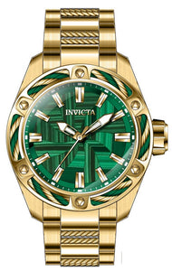 Band Material: Stainless Steel,Cable, Band Tone: Gold, Band Width: 26MM, Band Length: 190MM, Crown Type: Push, Case Material: Stainless Steel, Case Tone: Gold, Case Size [mm]: 52, Case Back: Solid, Material of Hands: Metal, Color of Hands: Gold, Crystal Type: Flame Fusion, Bezel Material: Stainless Steel,Cable, Dial Material: Metal, Dial Color: Green .Purchasing these parts and having a non-authorized repair center open your watch voids all manufacturing warranties. Invicta cannot guarantee the quality standards of an altered timepiece, the standard 3-year limited warranty on Invicta timepieces shall be invalid if the timepiece is serviced at any time by an unauthorized repair center. This includes battery replacements, which must be done at an Invicta authorized repair center in order to maintain the eligibility of the warranty. Please follow the link below to learn more about Invicta's warranty.https://cdn.invictawatch.com/www/files/invicta-warranty-2018.pdf