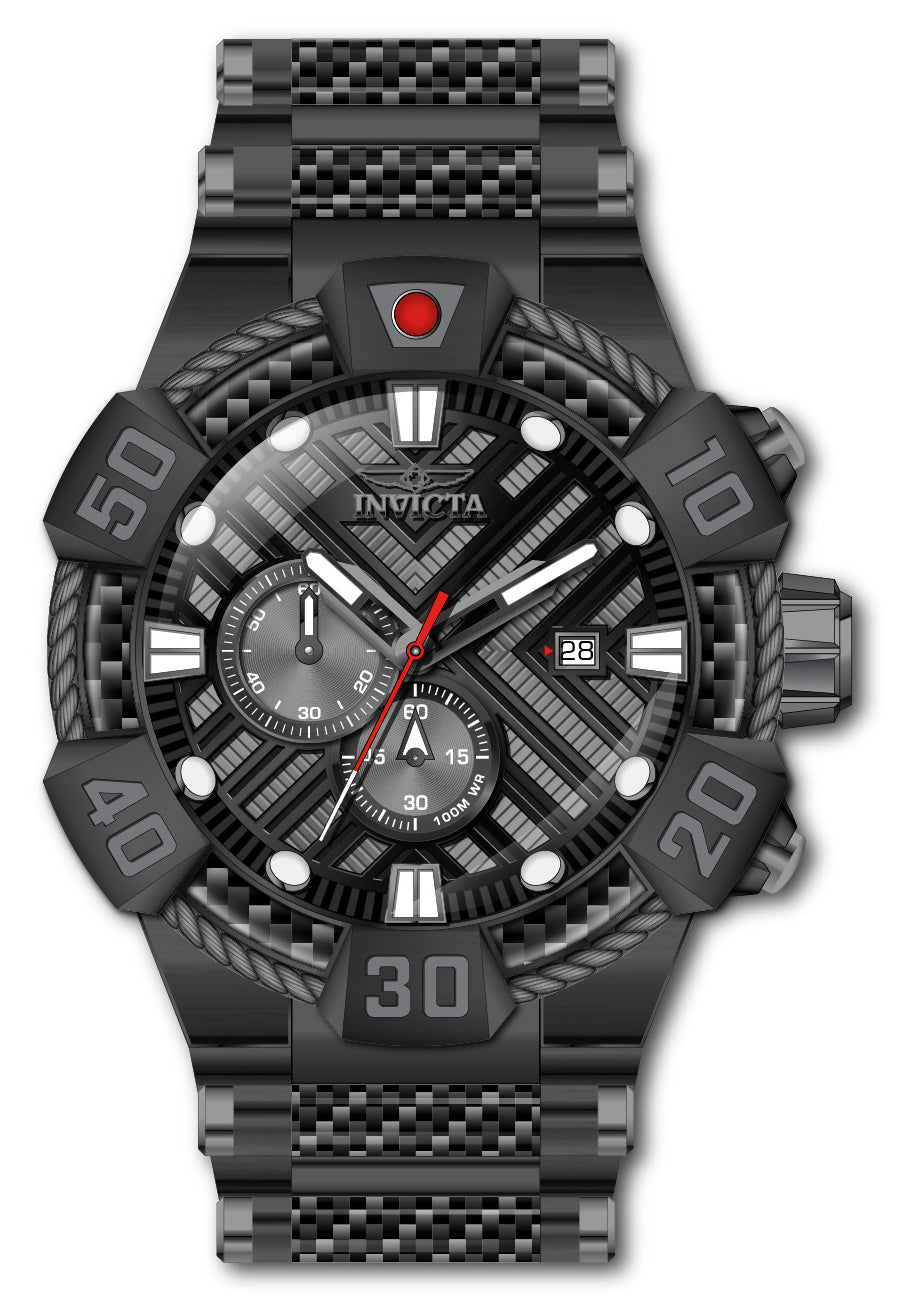 Band Material: Stainless Steel,Carbon Fiber, Band Tone: Black, Band Width: 32MM, Band Length: 190MM, Crown Type: Push, Case Material: Stainless Steel, Case Tone: Black, Case Size [mm]: 52, Case Back: Solid, Material of Hands: Metal, Color of Hands: Red,Gunmetal, Crystal Type: Flame Fusion, Bezel Material: Stainless Steel,Carbon Fiber,Cable, Dial Material: Metal, Dial Color: Black,Gunmetal .Purchasing these parts and having a non-authorized repair center open your watch voids all manufacturing warranties. Invicta cannot guarantee the quality standards of an altered timepiece, the standard 3-year limited warranty on Invicta timepieces shall be invalid if the timepiece is serviced at any time by an unauthorized repair center. This includes battery replacements, which must be done at an Invicta authorized repair center in order to maintain the eligibility of the warranty. Please follow the link below to learn more about Invicta's warranty.https://cdn.invictawatch.com/www/files/invicta-warranty-2018.pdf