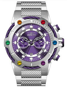 Band Material: Stainless Steel, Band Tone: Steel, Band Width: 30MM, Band Length: 210MM, Crown Type: Push, Case Material: Stainless Steel, Case Tone: Steel, Case Size [mm]: 51.5, Case Back: Solid, Material of Hands: Metal, Color of Hands: Silver,Purple, Crystal Type: Flame Fusion, Bezel Material: Stainless Steel,Cable, Dial Material: Metal, Dial Color: Purple, Dial Pattern: None .Purchasing these parts and having a non-authorized repair center open your watch voids all manufacturing warranties. Invicta cannot guarantee the quality standards of an altered timepiece, the standard 3-year limited warranty on Invicta timepieces shall be invalid if the timepiece is serviced at any time by an unauthorized repair center. This includes battery replacements, which must be done at an Invicta authorized repair center in order to maintain the eligibility of the warranty. Please follow the link below to learn more about Invicta's warranty.https://cdn.invictawatch.com/www/files/invicta-warranty-2018.pdf