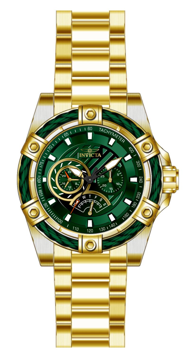 Band Material: Stainless Steel, Band Tone: Gold, Band Width: 26MM, Band Length: 185MM, Crown Type: Push, Case Material: Stainless Steel, Case Tone: Gold, Case Size [mm]: 52, Crystal Type: Flame Fusion, Dial Material: Brass, Dial Color: Green .Purchasing these parts and having a non-authorized repair center open your watch voids all manufacturing warranties. Invicta cannot guarantee the quality standards of an altered timepiece, the standard 3-year limited warranty on Invicta timepieces shall be invalid if the timepiece is serviced at any time by an unauthorized repair center. This includes battery replacements, which must be done at an Invicta authorized repair center in order to maintain the eligibility of the warranty. Please follow the link below to learn more about Invicta's warranty.https://cdn.invictawatch.com/www/files/invicta-warranty-2018.pdf