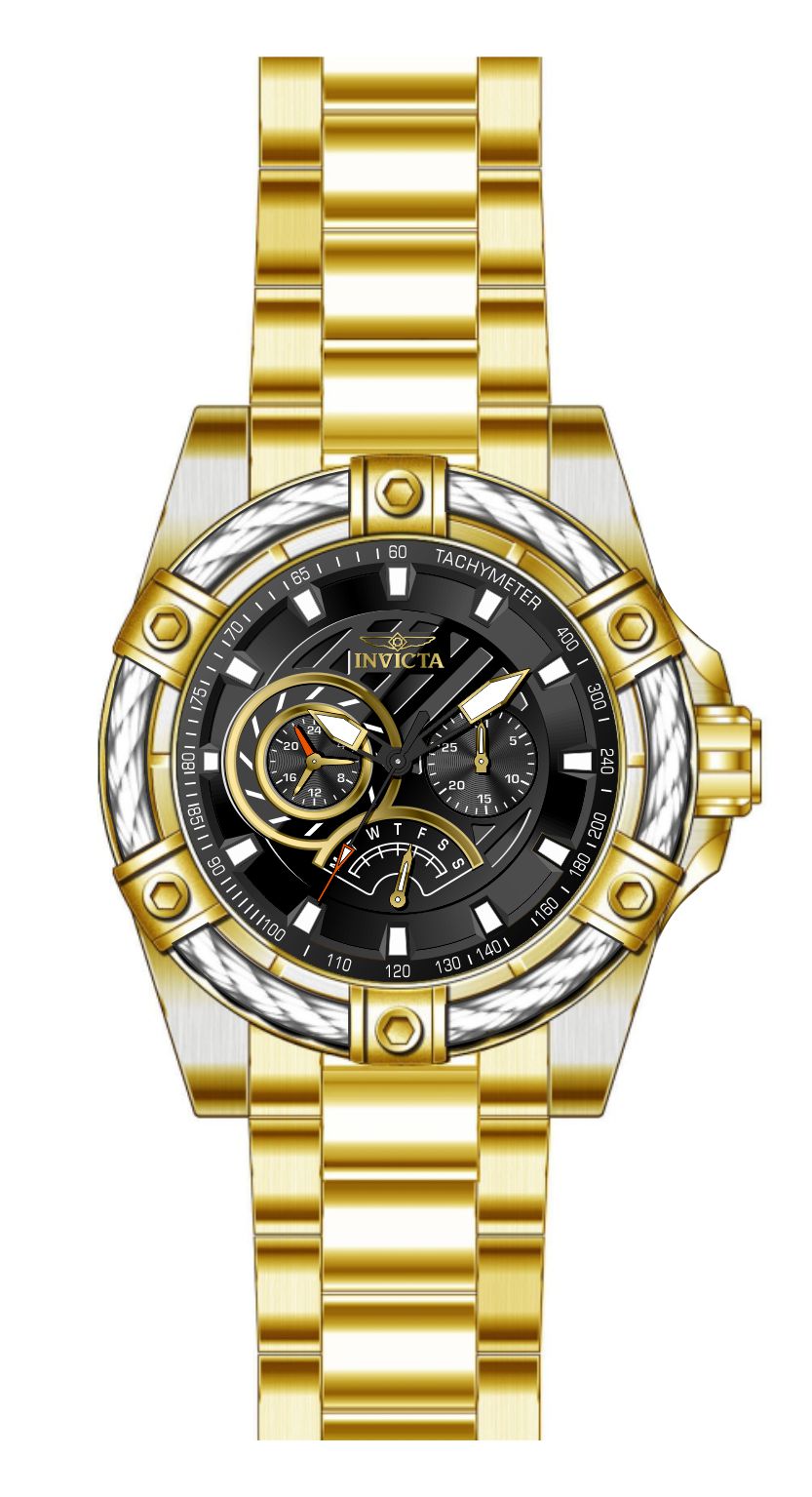 Band Material: Stainless Steel, Band Tone: Gold, Band Width: 26MM, Band Length: 185MM, Crown Type: Push, Case Material: Stainless Steel, Case Tone: Gold, Case Size [mm]: 52, Crystal Type: Flame Fusion, Dial Material: Brass, Dial Color: Black .Purchasing these parts and having a non-authorized repair center open your watch voids all manufacturing warranties. Invicta cannot guarantee the quality standards of an altered timepiece, the standard 3-year limited warranty on Invicta timepieces shall be invalid if the timepiece is serviced at any time by an unauthorized repair center. This includes battery replacements, which must be done at an Invicta authorized repair center in order to maintain the eligibility of the warranty. Please follow the link below to learn more about Invicta's warranty.https://cdn.invictawatch.com/www/files/invicta-warranty-2018.pdf