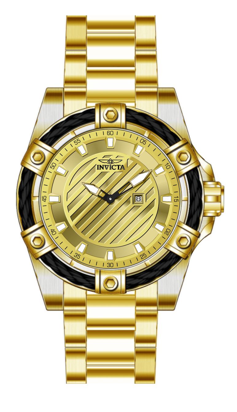 Band Material: Stainless Steel, Band Tone: Gold, Band Width: 26MM, Band Length: 185MM, Crown Type: Push, Case Material: Stainless Steel, Case Tone: Gold, Case Size [mm]: 52, Crystal Type: Flame Fusion, Dial Material: Brass, Dial Color: Gold .Purchasing these parts and having a non-authorized repair center open your watch voids all manufacturing warranties. Invicta cannot guarantee the quality standards of an altered timepiece, the standard 3-year limited warranty on Invicta timepieces shall be invalid if the timepiece is serviced at any time by an unauthorized repair center. This includes battery replacements, which must be done at an Invicta authorized repair center in order to maintain the eligibility of the warranty. Please follow the link below to learn more about Invicta's warranty.https://cdn.invictawatch.com/www/files/invicta-warranty-2018.pdf
