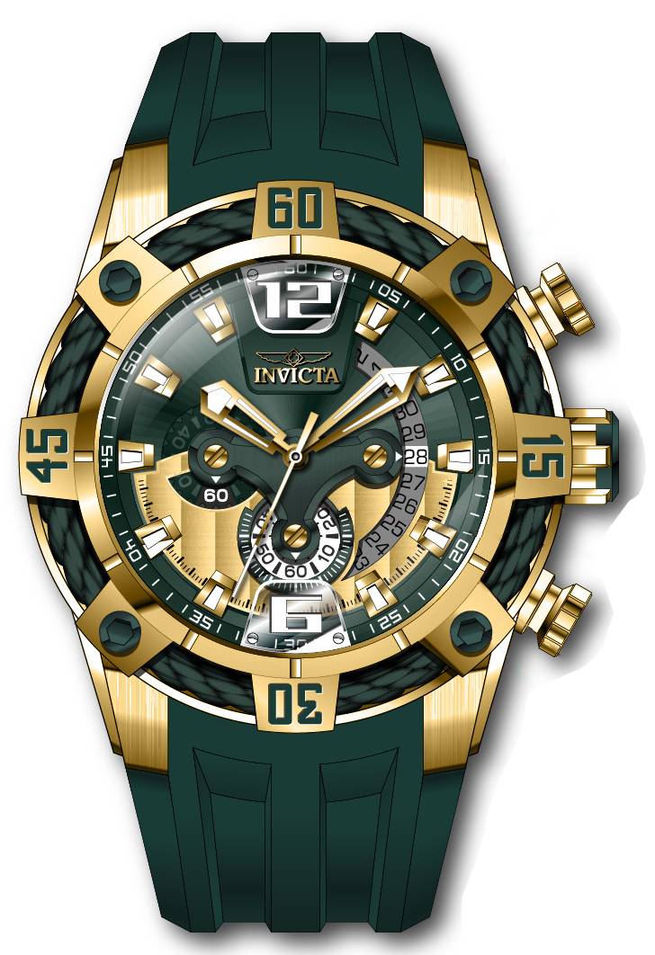 Band Material: Silicone, Band Tone: Green, Band Width: 32MM, Band Length: 210MM, Crown Type: Push, Case Material: Stainless Steel, Case Tone: Gold, Case Size [mm]: 51, Case Back: Solid, Material of Hands: Metal, Color of Hands: Gold, Crystal Type: Flame Fusion, Bezel Material: Stainless Steel,Cable, Dial Material: Metal, Dial Color: Gold,Green, Dial Pattern: None .Purchasing these parts and having a non-authorized repair center open your watch voids all manufacturing warranties. Invicta cannot guarantee the quality standards of an altered timepiece, the standard 3-year limited warranty on Invicta timepieces shall be invalid if the timepiece is serviced at any time by an unauthorized repair center. This includes battery replacements, which must be done at an Invicta authorized repair center in order to maintain the eligibility of the warranty. Please follow the link below to learn more about Invicta's warranty.https://cdn.invictawatch.com/www/files/invicta-warranty-2018.pdf