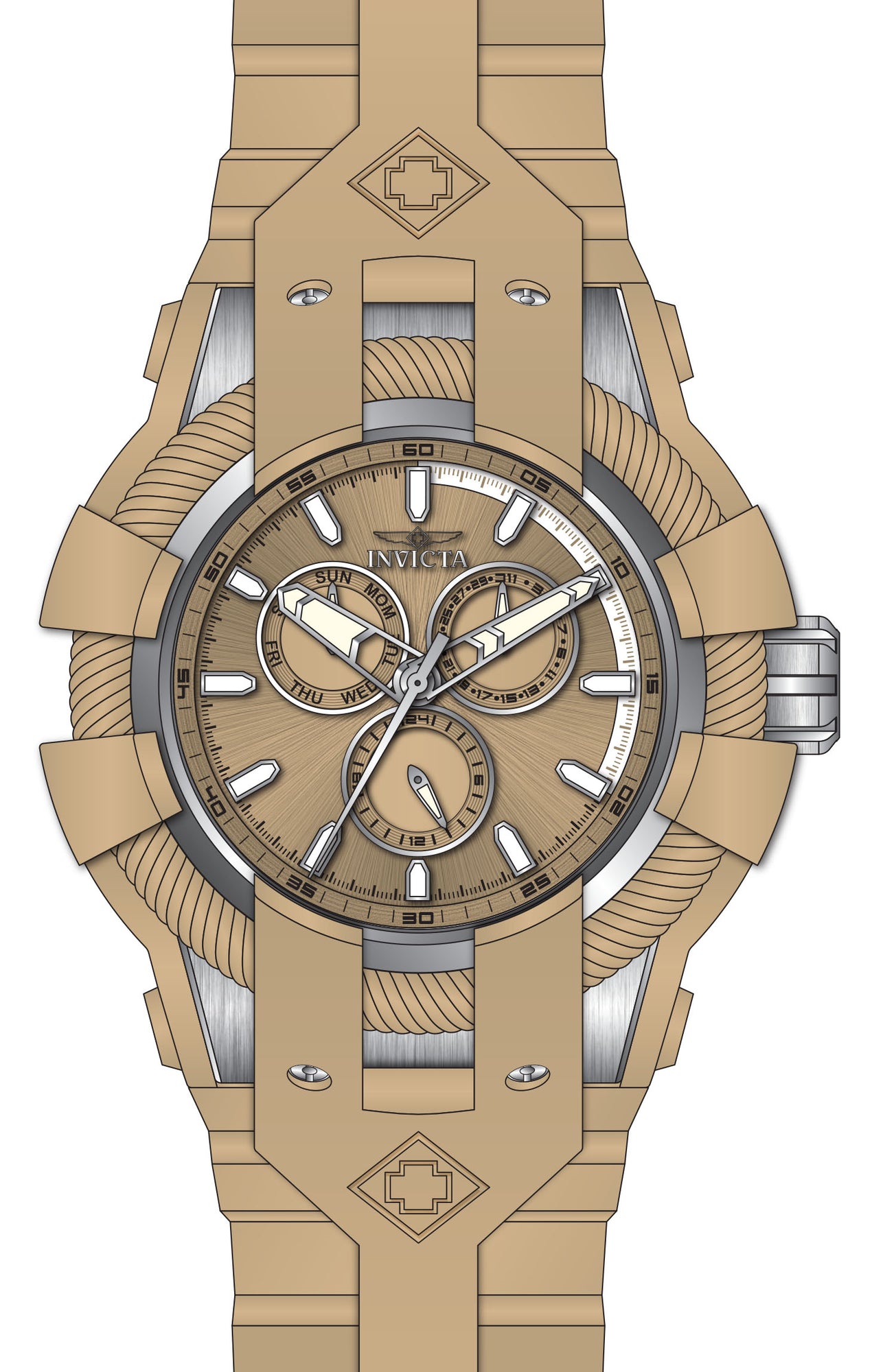 Band Material: Silicone, Band Tone: Khaki, Band Width: 32MM, Band Length: 210MM, Crown Type: Push, Case Material: Stainless Steel,Silicone, Case Tone: Khaki,Steel, Case Size [mm]: 50, Case Back: Solid screwed, Material of Hands: Metal, Color of Hands: Silver,Luminous, Crystal Type: Mineral, Bezel Material: Stainless Steel, Dial Material: Metal, Dial Color: Khaki, Dial Pattern: Sun-ray Finish .Purchasing these parts and having a non-authorized repair center open your watch voids all manufacturing warranties. Invicta cannot guarantee the quality standards of an altered timepiece, the standard 3-year limited warranty on Invicta timepieces shall be invalid if the timepiece is serviced at any time by an unauthorized repair center. This includes battery replacements, which must be done at an Invicta authorized repair center in order to maintain the eligibility of the warranty. Please follow the link below to learn more about Invicta's warranty.https://cdn.invictawatch.com/www/files/invicta-warranty-2018.pdf