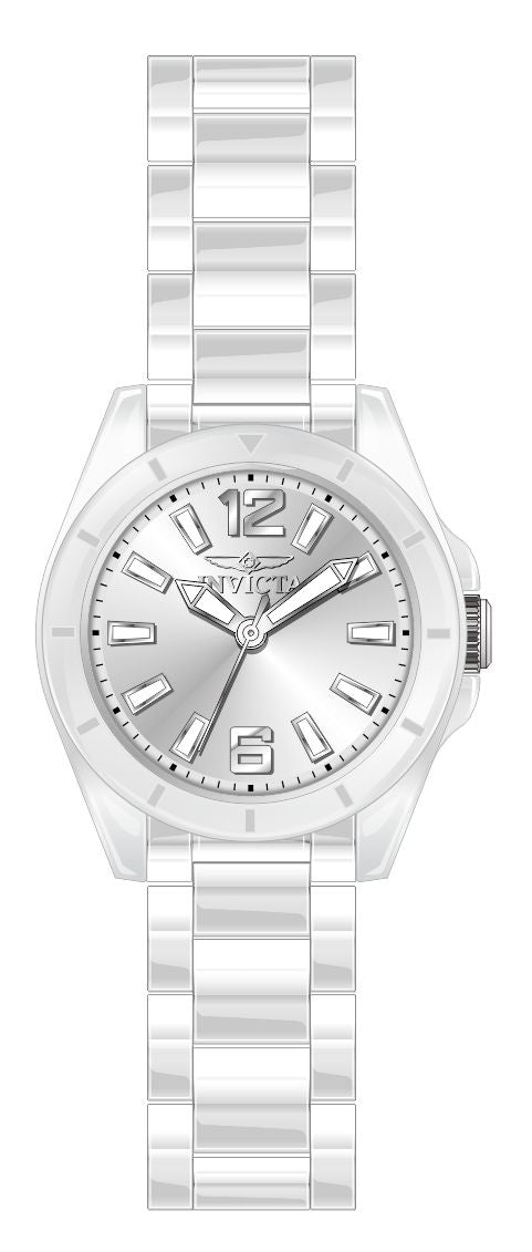 Band Material: Ceramic, Band Tone: White, Band Width: 16MM, Band Length: 168MM, Crown Type: Push, Case Material: Ceramic, Case Tone: White, Case Size [mm]: 32, Crystal Type: Flame Fusion, Dial Material: Brass, Dial Color: Silver .Purchasing these parts and having a non-authorized repair center open your watch voids all manufacturing warranties. Invicta cannot guarantee the quality standards of an altered timepiece, the standard 3-year limited warranty on Invicta timepieces shall be invalid if the timepiece is serviced at any time by an unauthorized repair center. This includes battery replacements, which must be done at an Invicta authorized repair center in order to maintain the eligibility of the warranty. Please follow the link below to learn more about Invicta's warranty.https://cdn.invictawatch.com/www/files/invicta-warranty-2018.pdf