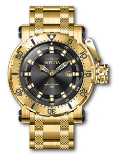 Band Material: Stainless Steel, Band Tone: Gold, Band Width: 26MM, Band Length: 198MM, Crown Type: Push, Case Material: Stainless Steel, Case Tone: Gold, Case Size [mm]: 52, Case Back: Solid, Material of Hands: Metal, Color of Hands: Gold, Crystal Type: Flame Fusion, Bezel Material: Stainless Steel, Dial Material: Metal, Dial Color: Black, Dial Pattern: Sun-ray Finish .Purchasing these parts and having a non-authorized repair center open your watch voids all manufacturing warranties. Invicta cannot guarantee the quality standards of an altered timepiece, the standard 3-year limited warranty on Invicta timepieces shall be invalid if the timepiece is serviced at any time by an unauthorized repair center. This includes battery replacements, which must be done at an Invicta authorized repair center in order to maintain the eligibility of the warranty. Please follow the link below to learn more about Invicta's warranty.https://cdn.invictawatch.com/www/files/invicta-warranty-2018.pdf