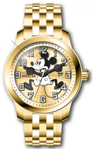 INVICTA Disney Limited Edition Men 45mm Stainless Steel Gold Gold dial VJ42 Quartz , Band Material: Stainless Steel, Band Tone: Gold, Band Size [mm]: 22, Band Length [mm]: 200, Buckle Type: Butterfly push button , Crown Type : Push, Case Material : Stainless Steel, Case Tone : Gold, Case Size (mm) : 45, Case Back : Solid, Material of Hands : Metal, Color of Hands : Black, Crystal Type : Flame Fusion, Bezel Material : Stainless Steel, Dial Material : Metal, Dial Color : Gold .Purchasing these parts and having a non-authorized repair center open your watch voids all manufacturing warranties. Invicta cannot guarantee the quality standards of an altered timepiece, the standard 3-year limited warranty on Invicta timepieces shall be invalid if the timepiece is serviced at any time by an unauthorized repair center. This includes battery replacements, which must be done at an Invicta authorized repair center in order to maintain the eligibility of the warranty. Please follow the link below to learn more about Invicta's warranty.https://cdn.invictawatch.com/www/files/invicta-warranty-2018.pdf