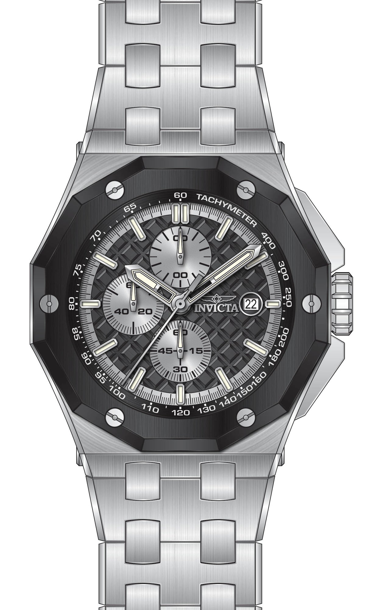 Band Material: Stainless Steel, Band Tone: Steel, Band Width: 28MM, Band Length: 210MM, Crown Type: Push, Case Material: Stainless Steel, Case Tone: Black,Steel, Case Size [mm]: 48.00, Case Back: Solid, Material of Hands: Metal, Color of Hands: Silver,Luminous, Crystal Type: Mineral, Bezel Material: Stainless Steel, Dial Material: Metal, Dial Color: Black,Silver, Dial Pattern: Textured Pattern .Purchasing these parts and having a non-authorized repair center open your watch voids all manufacturing warranties. Invicta cannot guarantee the quality standards of an altered timepiece, the standard 3-year limited warranty on Invicta timepieces shall be invalid if the timepiece is serviced at any time by an unauthorized repair center. This includes battery replacements, which must be done at an Invicta authorized repair center in order to maintain the eligibility of the warranty. Please follow the link below to learn more about Invicta's warranty.https://cdn.invictawatch.com/www/files/invicta-warranty-2018.pdf