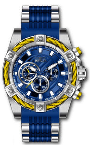 Band Material: Stainless Steel,Silicone, Band Tone: Steel,Blue, Band Width: 26MM, Band Length: 200MM, Crown Type: Push, Case Material: Stainless Steel, Case Tone: Steel, Case Size [mm]: 52, Case Back: Solid, Material of Hands: Metal, Color of Hands: Silver,Blue,Yellow, Crystal Type: Flame Fusion, Bezel Material: Stainless Steel,Cable, Dial Material: Metal, Dial Color: Blue, Dial Pattern: Sun-ray Finish .Purchasing these parts and having a non-authorized repair center open your watch voids all manufacturing warranties. Invicta cannot guarantee the quality standards of an altered timepiece, the standard 3-year limited warranty on Invicta timepieces shall be invalid if the timepiece is serviced at any time by an unauthorized repair center. This includes battery replacements, which must be done at an Invicta authorized repair center in order to maintain the eligibility of the warranty. Please follow the link below to learn more about Invicta's warranty.https://cdn.invictawatch.com/www/files/invicta-warranty-2018.pdf