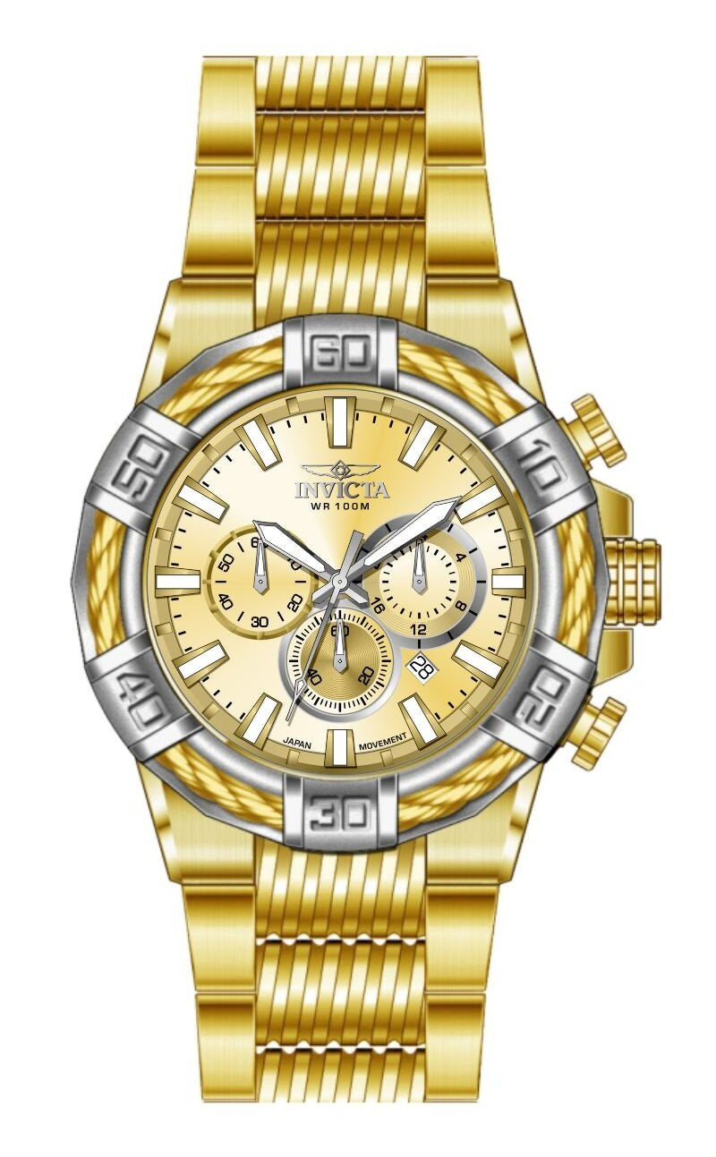 Band Material: Stainless Steel, Band Tone: Gold, Band Width: 30MM, Band Length: 193MM, Crown Type: Push, Case Material: Stainless Steel, Case Tone: Gold, Case Size [mm]: 51, Case Back: Solid, Material of Hands: Brass, Color of Hands: Silver,Luminous, Crystal Type: Mineral, Bezel Material: Stainless Steel,Cable, Dial Material: Brass, Dial Color: Gold, Dial Pattern: Sun-ray Finish .Purchasing these parts and having a non-authorized repair center open your watch voids all manufacturing warranties. Invicta cannot guarantee the quality standards of an altered timepiece, the standard 3-year limited warranty on Invicta timepieces shall be invalid if the timepiece is serviced at any time by an unauthorized repair center. This includes battery replacements, which must be done at an Invicta authorized repair center in order to maintain the eligibility of the warranty. Please follow the link below to learn more about Invicta's warranty.https://cdn.invictawatch.com/www/files/invicta-warranty-2018.pdf