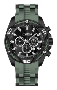 Band Material: Stainless Steel,Silicone, Band Tone: Black,Green, Band Width: 26MM, Band Length: 210MM, Crown Type: Push, Case Material: Stainless Steel, Case Tone: Black, Case Size [mm]: 50, Case Back: Solid, Material of Hands: Metal, Color of Hands: Silver,Green,Luminous, Crystal Type: Mineral, Bezel Material: Stainless Steel,Cable, Dial Material: Metal, Dial Color: Black, Dial Pattern: Sun-ray Finish .Purchasing these parts and having a non-authorized repair center open your watch voids all manufacturing warranties. Invicta cannot guarantee the quality standards of an altered timepiece, the standard 3-year limited warranty on Invicta timepieces shall be invalid if the timepiece is serviced at any time by an unauthorized repair center. This includes battery replacements, which must be done at an Invicta authorized repair center in order to maintain the eligibility of the warranty. Please follow the link below to learn more about Invicta's warranty.https://cdn.invictawatch.com/www/files/invicta-warranty-2018.pdf