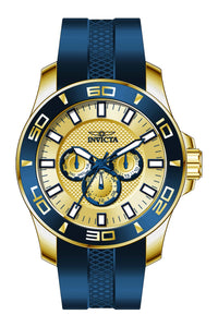 INVICTA Pro Diver Men 50mm Stainless Steel Gold Gold dial VH63 Quartz , Band Material: Silicone, Band Tone: Blue, Band Size [mm]: 26, Band Length [mm]: 185, Buckle Type: Buckle , Crown Type : Push, Case Material : Stainless Steel, Case Tone : Gold, Case Size (mm) : 50, Case Back : Solid, Material of Hands : Metal, Color of Hands : Blue, Crystal Type : Flame Fusion, Bezel Material : Stainless Steel,Aluminum, Dial Material : Metal, Dial Color : Gold, Dial Pattern : Textured Pattern .Purchasing these parts and having a non-authorized repair center open your watch voids all manufacturing warranties. Invicta cannot guarantee the quality standards of an altered timepiece, the standard 3-year limited warranty on Invicta timepieces shall be invalid if the timepiece is serviced at any time by an unauthorized repair center. This includes battery replacements, which must be done at an Invicta authorized repair center in order to maintain the eligibility of the warranty. Please follow the link below to learn more about Invicta's warranty.https://cdn.invictawatch.com/www/files/invicta-warranty-2018.pdf