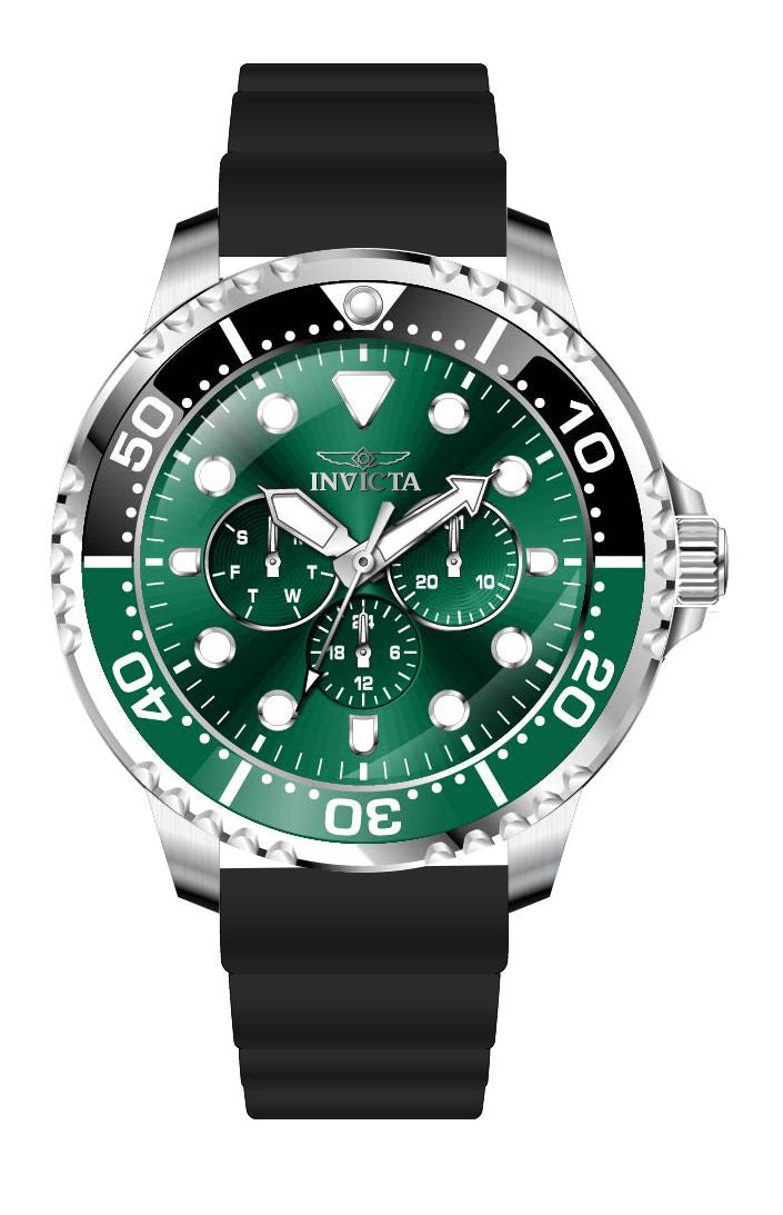 Band Material: Silicone, Band Tone: Black, Band Width: 22MM, Band Length: 218MM, Crown Type: Push, Case Material: Stainless Steel, Case Tone: Steel, Case Size [mm]: 48, Crystal Type: Flame Fusion, Dial Material: Brass, Dial Color: Green .Purchasing these parts and having a non-authorized repair center open your watch voids all manufacturing warranties. Invicta cannot guarantee the quality standards of an altered timepiece, the standard 3-year limited warranty on Invicta timepieces shall be invalid if the timepiece is serviced at any time by an unauthorized repair center. This includes battery replacements, which must be done at an Invicta authorized repair center in order to maintain the eligibility of the warranty. Please follow the link below to learn more about Invicta's warranty.https://cdn.invictawatch.com/www/files/invicta-warranty-2018.pdf