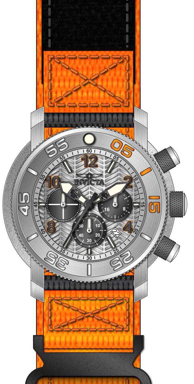 Band Material: Nylon, Band Tone: Black,Orange, Band Width: 26.00MM, Band Length: 185MM, Crown Type: Push, Case Material: Stainless Steel, Case Tone: Steel, Case Size [mm]: 50.00, Case Back: Solid screwed, Material of Hands: Metal, Color of Hands: Silver,Luminous,Gunmetal, Crystal Type: Mineral, Bezel Material: Stainless Steel, Dial Material: Metal, Dial Color: Black,Silver, Dial Pattern: Textured Pattern .Purchasing these parts and having a non-authorized repair center open your watch voids all manufacturing warranties. Invicta cannot guarantee the quality standards of an altered timepiece, the standard 3-year limited warranty on Invicta timepieces shall be invalid if the timepiece is serviced at any time by an unauthorized repair center. This includes battery replacements, which must be done at an Invicta authorized repair center in order to maintain the eligibility of the warranty. Please follow the link below to learn more about Invicta's warranty.https://cdn.invictawatch.com/www/files/invicta-warranty-2018.pdf