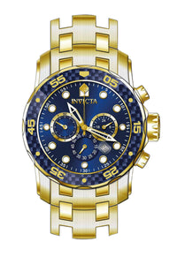 INVICTA Pro Diver Men 48mm Stainless Steel Gold Blue dial VD53 Quartz , Band Material: Stainless Steel, Band Tone: Gold, Band Size [mm]: 26, Band Length [mm]: 215, Buckle Type: Fold over safety , Crown Type : Push, Case Material : Stainless Steel, Case Tone : Gold, Case Size (mm) : 48, Case Back : Solid, Material of Hands : Metal, Color of Hands : White,Red,Gold, Crystal Type : Flame Fusion, Bezel Material : Stainless Steel,Carbon Fiber, Dial Material : Metal, Dial Color : Blue, Dial Pattern : Sun-ray Finish .Purchasing these parts and having a non-authorized repair center open your watch voids all manufacturing warranties. Invicta cannot guarantee the quality standards of an altered timepiece, the standard 3-year limited warranty on Invicta timepieces shall be invalid if the timepiece is serviced at any time by an unauthorized repair center. This includes battery replacements, which must be done at an Invicta authorized repair center in order to maintain the eligibility of the warranty. Please follow the link below to learn more about Invicta's warranty.https://cdn.invictawatch.com/www/files/invicta-warranty-2018.pdf