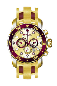 INVICTA Pro Diver Men 48mm Stainless Steel Gold Gold dial VD53 Quartz , Band Material: Stainless Steel, Band Tone: Gold,Burgundy, Band Size [mm]: 26, Band Length [mm]: 215, Buckle Type: Fold over safety , Crown Type : Push, Case Material : Stainless Steel, Case Tone : Gold, Case Size (mm) : 48, Case Back : Solid, Material of Hands : Metal, Color of Hands : Burgundy, Crystal Type : Flame Fusion, Bezel Material : Stainless Steel, Dial Material : Metal, Dial Color : Gold, Dial Pattern : Sun-ray Finish .Purchasing these parts and having a non-authorized repair center open your watch voids all manufacturing warranties. Invicta cannot guarantee the quality standards of an altered timepiece, the standard 3-year limited warranty on Invicta timepieces shall be invalid if the timepiece is serviced at any time by an unauthorized repair center. This includes battery replacements, which must be done at an Invicta authorized repair center in order to maintain the eligibility of the warranty. Please follow the link below to learn more about Invicta's warranty.https://cdn.invictawatch.com/www/files/invicta-warranty-2018.pdf