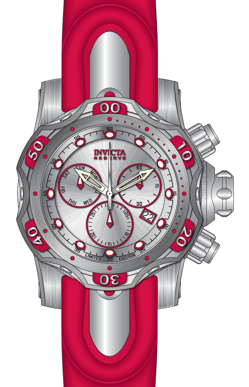 Band Material: Stainless Steel,Silicone,Aluminium, Band Tone: Steel,Red, Band Width: 26MM, Band Length: 210MM, Crown Type: Screw Down, Case Material: Stainless Steel,Aluminum, Case Tone: Red,Silver,Steel, Case Size [mm]: 52.5, Case Back: Solid, Material of Hands: Metal, Color of Hands: Silver,Red,Luminous, Crystal Type: Flame Fusion, Bezel Material: Stainless Steel,Aluminum, Dial Material: Metal, Dial Color: Silver,Red, Dial Pattern: Textured Pattern .Purchasing these parts and having a non-authorized repair center open your watch voids all manufacturing warranties. Invicta cannot guarantee the quality standards of an altered timepiece, the standard 3-year limited warranty on Invicta timepieces shall be invalid if the timepiece is serviced at any time by an unauthorized repair center. This includes battery replacements, which must be done at an Invicta authorized repair center in order to maintain the eligibility of the warranty. Please follow the link below to learn more about Invicta's warranty.https://cdn.invictawatch.com/www/files/invicta-warranty-2018.pdf