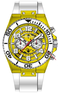Band Material: Silicone, Band Tone: White, Band Width: 30MM, Band Length: 210MM, Buckle Type: Buckle, Crown Type : Push, Case Material : Polyurethane, Case Tone : Yellow, Case Size [mm] : 48, Case Back : Solid, Material of Hands : Metal, Color of Hands : White,Silver,Red, Crystal Type : Flame Fusion, Bezel Material : Stainless Steel, Dial Material : Stainless Steel, Dial Color : Yellow, Dial Pattern : Sun-ray Finish .Purchasing these parts and having a non-authorized repair center open your watch voids all manufacturing warranties. Invicta cannot guarantee the quality standards of an altered timepiece, the standard 3-year limited warranty on Invicta timepieces shall be invalid if the timepiece is serviced at any time by an unauthorized repair center. This includes battery replacements, which must be done at an Invicta authorized repair center in order to maintain the eligibility of the warranty. Please follow the link below to learn more about Invicta's warranty.https://cdn.invictawatch.com/www/files/invicta-warranty-2018.pdf