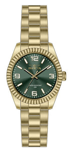 Band Material: Stainless Steel, Band Tone: Gold, Band Width: 18MM, Band Length: 166MM, Crown Type: Push, Case Material: Stainless Steel, Case Tone: Gold, Case Size [mm]: 36, Crystal Type: Mineral, Dial Material: Brass, Dial Color: Green .Purchasing these parts and having a non-authorized repair center open your watch voids all manufacturing warranties. Invicta cannot guarantee the quality standards of an altered timepiece, the standard 3-year limited warranty on Invicta timepieces shall be invalid if the timepiece is serviced at any time by an unauthorized repair center. This includes battery replacements, which must be done at an Invicta authorized repair center in order to maintain the eligibility of the warranty. Please follow the link below to learn more about Invicta's warranty.https://cdn.invictawatch.com/www/files/invicta-warranty-2018.pdf