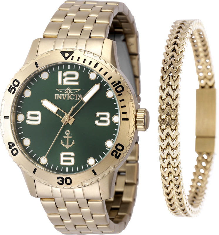 Band Material: Stainless Steel, Band Tone: Gold, Band Width: 20MM, Band Length: 182MM, Crown Type: Push, Case Material: Stainless Steel, Case Tone: Gold, Case Size [mm]: 42, Color of Hands: Luminous, Gold, Crystal Type: Mineral, Bezel Material: None, Dial Material: Brass, Dial Color: Green .Purchasing these parts and having a non-authorized repair center open your watch voids all manufacturing warranties. Invicta cannot guarantee the quality standards of an altered timepiece, the standard 3-year limited warranty on Invicta timepieces shall be invalid if the timepiece is serviced at any time by an unauthorized repair center. This includes battery replacements, which must be done at an Invicta authorized repair center in order to maintain the eligibility of the warranty. Please follow the link below to learn more about Invicta's warranty.https://cdn.invictawatch.com/www/files/invicta-warranty-2018.pdf