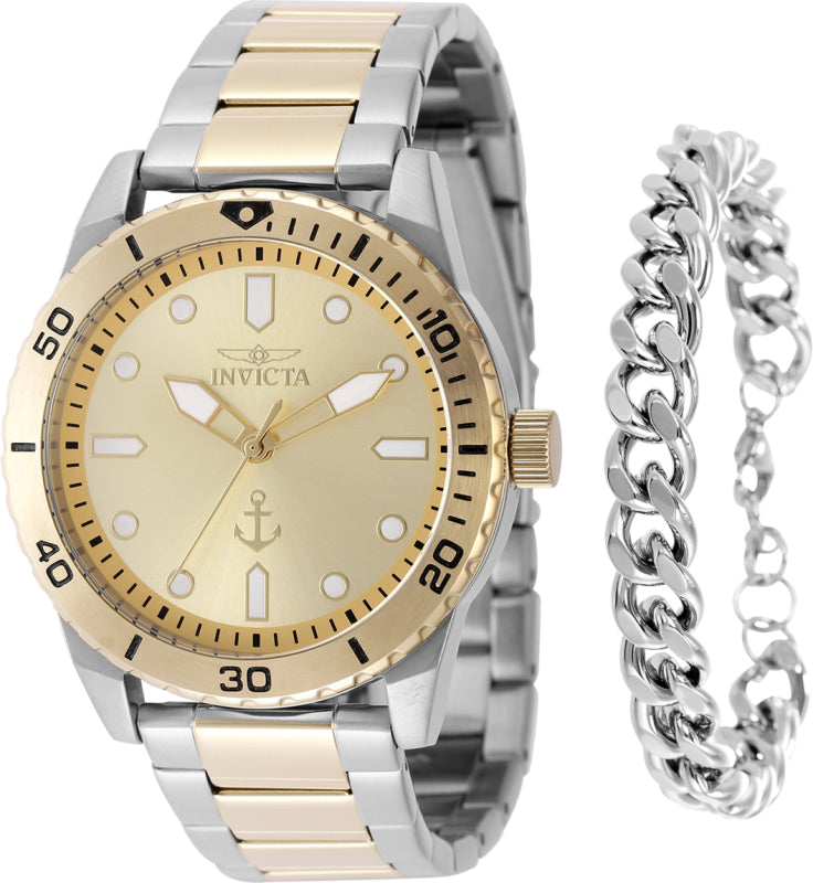 Band Material: Stainless Steel, Band Tone: Gold, Steel, Band Width: 22MM, Band Length: 186MM, Crown Type: Push, Case Material: Stainless Steel, Case Tone: Steel, Gold, Case Size [mm]: 43, Color of Hands: Luminous, Gold, Crystal Type: Mineral, Bezel Material: None, Dial Material: Brass, Dial Color: Gold .Purchasing these parts and having a non-authorized repair center open your watch voids all manufacturing warranties. Invicta cannot guarantee the quality standards of an altered timepiece, the standard 3-year limited warranty on Invicta timepieces shall be invalid if the timepiece is serviced at any time by an unauthorized repair center. This includes battery replacements, which must be done at an Invicta authorized repair center in order to maintain the eligibility of the warranty. Please follow the link below to learn more about Invicta's warranty.https://cdn.invictawatch.com/www/files/invicta-warranty-2018.pdf