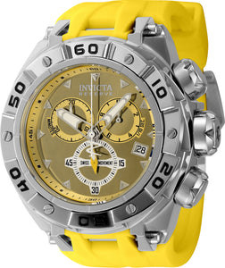 Band Material: Silicone, Band Tone: Yellow, Band Width: 33MM, Band Length: 200MM, Crown Type: Screw Down, Case Material: Stainless Steel, Case Tone: Steel, Case Size [mm]: 52.7, Color of Hands: Luminous, Yellow, Silver, Crystal Type: Flame Fusion, Bezel Material: Stainless Steel, Dial Material: Metal, Dial Color: Yellow .Purchasing these parts and having a non-authorized repair center open your watch voids all manufacturing warranties. Invicta cannot guarantee the quality standards of an altered timepiece, the standard 3-year limited warranty on Invicta timepieces shall be invalid if the timepiece is serviced at any time by an unauthorized repair center. This includes battery replacements, which must be done at an Invicta authorized repair center in order to maintain the eligibility of the warranty. Please follow the link below to learn more about Invicta's warranty.https://cdn.invictawatch.com/www/files/invicta-warranty-2018.pdf