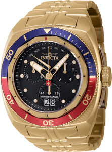Band Material: Stainless Steel, Band Tone: Gold, Band Width: 33MM, Band Length: 210MM, Crown Type: Screw Down, Case Material: Aluminum, Stainless Steel, Case Tone: Silver, Red, Blue, Gold, Case Size [mm]: 52.00, Color of Hands: Luminous, Gold, Red, Crystal Type: Sapphire, Bezel Material: Aluminum, Stainless Steel, Dial Material: Metal, Dial Color: Black .Purchasing these parts and having a non-authorized repair center open your watch voids all manufacturing warranties. Invicta cannot guarantee the quality standards of an altered timepiece, the standard 3-year limited warranty on Invicta timepieces shall be invalid if the timepiece is serviced at any time by an unauthorized repair center. This includes battery replacements, which must be done at an Invicta authorized repair center in order to maintain the eligibility of the warranty. Please follow the link below to learn more about Invicta's warranty.https://cdn.invictawatch.com/www/files/invicta-warranty-2018.pdf