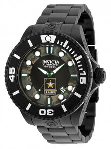Band Material: Stainless Steel, Band Tone: Black, Band Width: 22MM, Band Length: 210MM, Crown Type: Screw Down, Case Material: Stainless Steel, Case Tone: Black, Case Size [mm]: 47, Color of Hands: Green, Luminous, Crystal Type: Flame Fusion, Bezel Material: Stainless Steel, Dial Material: Metal, Dial Color: Black, Green, Camouflage .Purchasing these parts and having a non-authorized repair center open your watch voids all manufacturing warranties. Invicta cannot guarantee the quality standards of an altered timepiece, the standard 3-year limited warranty on Invicta timepieces shall be invalid if the timepiece is serviced at any time by an unauthorized repair center. This includes battery replacements, which must be done at an Invicta authorized repair center in order to maintain the eligibility of the warranty. Please follow the link below to learn more about Invicta's warranty.https://cdn.invictawatch.com/www/files/invicta-warranty-2018.pdf
