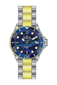 INVICTA Grand Diver Lady 40.70mm Stainless Steel + Aluminum Gold + Blue + Silver + Steel Blue dial NH35A Automatic , Band Material: Stainless Steel, Band Tone: Steel,Gold, Band Size [mm]: 20, Band Length [mm]: 185, Buckle Type: Fold over safety , Crown Type : Screw Down, Case Material : Stainless Steel,Aluminum, Case Tone : Gold,Blue,Silver,Steel, Case Size (mm) : 40.7, Case Back : Exhibition, Material of Hands : Metal, Color of Hands : Luminous,Steel, Crystal Type : Mineral, Bezel Material : Stainless Steel,Aluminum, Dial Material : Metal,Oyster,Abalone, Dial Color : Blue, Dial Pattern : None .Purchasing these parts and having a non-authorized repair center open your watch voids all manufacturing warranties. Invicta cannot guarantee the quality standards of an altered timepiece, the standard 3-year limited warranty on Invicta timepieces shall be invalid if the timepiece is serviced at any time by an unauthorized repair center. This includes battery replacements, which must be done at an Invicta authorized repair center in order to maintain the eligibility of the warranty. Please follow the link below to learn more about Invicta's warranty.https://cdn.invictawatch.com/www/files/invicta-warranty-2018.pdf