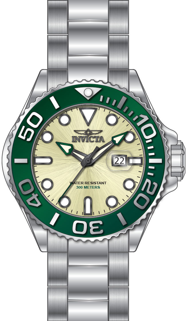 Band Material: Stainless Steel, Band Tone: Steel, Band Width: 24MM, Band Length: 210MM, Crown Type: Screw Down, Case Material: Stainless Steel,Aluminum, Case Tone: Green,Silver,Steel, Case Size [mm]: 52.00, Case Back: Solid screwed, Material of Hands: Metal, Color of Hands: Green,Luminous,Gunmetal, Crystal Type: Mineral, Bezel Material: Stainless Steel,Aluminum, Dial Material: Metal, Dial Color: Champagne, Dial Pattern: Sun-ray Finish .Purchasing these parts and having a non-authorized repair center open your watch voids all manufacturing warranties. Invicta cannot guarantee the quality standards of an altered timepiece, the standard 3-year limited warranty on Invicta timepieces shall be invalid if the timepiece is serviced at any time by an unauthorized repair center. This includes battery replacements, which must be done at an Invicta authorized repair center in order to maintain the eligibility of the warranty. Please follow the link below to learn more about Invicta's warranty.https://cdn.invictawatch.com/www/files/invicta-warranty-2018.pdf