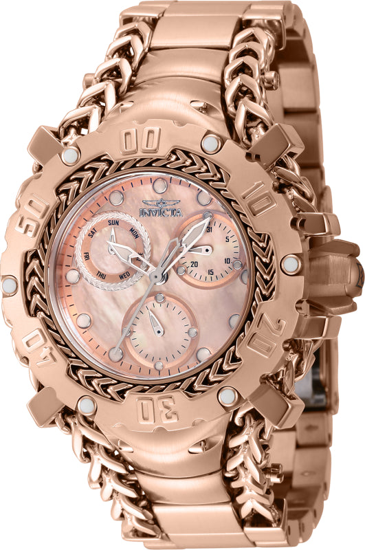 Band Material: Stainless Steel, Band Tone: Rose Gold, Band Width: 28.0MM, Band Length: 185MM, Crown Type: Screw Down, Case Material: Stainless Steel, Case Tone: Rose Gold, Case Size [mm]: 43.20, Color of Hands: Luminous, Silver, Crystal Type: Flame Fusion, Bezel Material: Stainless Steel, Dial Material: Oyster, Mother of Pearl, Metal, Dial Color: Pink, Rose Gold .Purchasing these parts and having a non-authorized repair center open your watch voids all manufacturing warranties. Invicta cannot guarantee the quality standards of an altered timepiece, the standard 3-year limited warranty on Invicta timepieces shall be invalid if the timepiece is serviced at any time by an unauthorized repair center. This includes battery replacements, which must be done at an Invicta authorized repair center in order to maintain the eligibility of the warranty. Please follow the link below to learn more about Invicta's warranty.https://cdn.invictawatch.com/www/files/invicta-warranty-2018.pdf