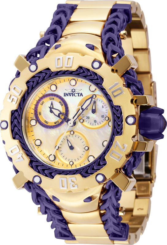 Band Material: Stainless Steel, Band Tone: Purple, Gold, Band Width: 28.0MM, Band Length: 185MM, Crown Type: Screw Down, Case Material: Stainless Steel, Case Tone: Purple, Gold, Case Size [mm]: 43.20, Color of Hands: Luminous, Purple, Crystal Type: Flame Fusion, Bezel Material: Stainless Steel, Dial Material: Oyster, Mother of Pearl, Metal, Dial Color: Purple, Gold .Purchasing these parts and having a non-authorized repair center open your watch voids all manufacturing warranties. Invicta cannot guarantee the quality standards of an altered timepiece, the standard 3-year limited warranty on Invicta timepieces shall be invalid if the timepiece is serviced at any time by an unauthorized repair center. This includes battery replacements, which must be done at an Invicta authorized repair center in order to maintain the eligibility of the warranty. Please follow the link below to learn more about Invicta's warranty.https://cdn.invictawatch.com/www/files/invicta-warranty-2018.pdf