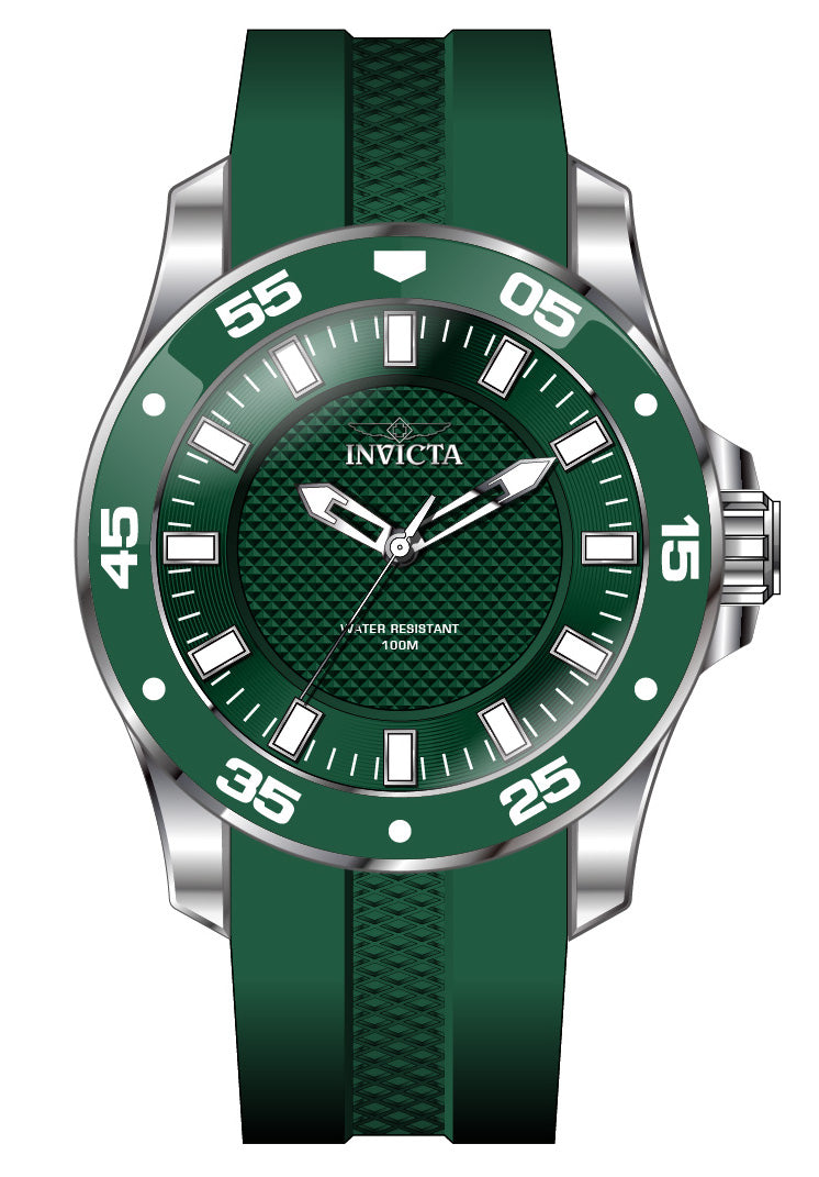 Band Material: Silicone, Band Tone: Green, Band Width: 26MM, Band Length: 210MM, Crown Type: Push, Case Material: Stainless Steel, Case Tone: Steel, Case Size [mm]: 50, Case Back: Solid, Material of Hands: Metal, Color of Hands: Silver, Crystal Type: Flame Fusion, Bezel Material: Stainless Steel,Aluminum, Dial Material: Metal, Dial Color: Green, Dial Pattern: Textured Pattern .Purchasing these parts and having a non-authorized repair center open your watch voids all manufacturing warranties. Invicta cannot guarantee the quality standards of an altered timepiece, the standard 3-year limited warranty on Invicta timepieces shall be invalid if the timepiece is serviced at any time by an unauthorized repair center. This includes battery replacements, which must be done at an Invicta authorized repair center in order to maintain the eligibility of the warranty. Please follow the link below to learn more about Invicta's warranty.https://cdn.invictawatch.com/www/files/invicta-warranty-2018.pdf