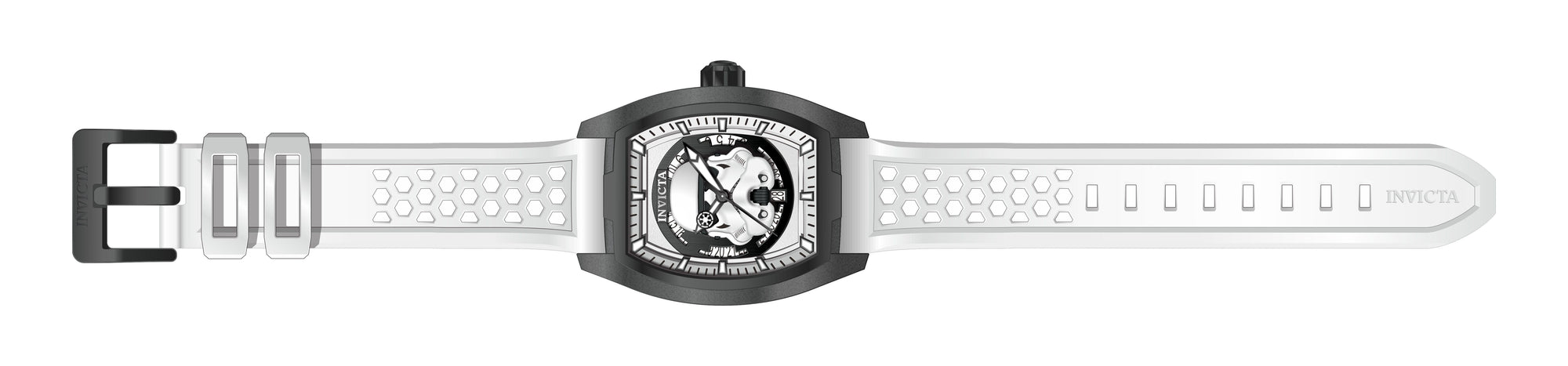 Individual Spare PARTS For Invicta Star Wars 26938, Band Material: Silicone, Band Tone: White, Band Size (mm): 22, Band Length (mm): 215, Buckle Type: Regular, Clasp Type: Regular, Crown Type Push, Case Material Stainless Steel, Case Tone Black, Case Size (mm) 42, Case Back Exhibition, Material of Hands Metal, Color of Hands Black, Luminous, Crystal Type Flame Fusion, Bezel Material None, Dial Material Metal, Dial Color Black, White, Dial Pattern Double LayeredPurchasing these parts and having a non-authorized repair center open your watch voids all manufacturing warranties. Invicta cannot guarantee the quality standards of an altered timepiece, the standard 3-year limited warranty on Invicta timepieces shall be invalid if the timepiece is serviced at any time by an unauthorized repair center. This includes battery replacements, which must be done at an Invicta authorized repair center in order to maintain the eligibility of the warranty. Please follow the link below to learn more about Invicta's warranty.https://cdn.invictawatch.com/www/files/invicta-warranty-2018.pdf