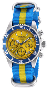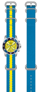 Band for Invicta Pro Diver 19524, Band Material: Nylon, Band Tone: Blue & Yellow Striped or Blue, Band Size in mm: 20, Band length in mm: 230, Buckle Type: Regular, Clasp Type: Regular. Please note that bands do not ship with spring bars or T bars. If you need these parts, please add them to your cart with the corresponding part sku.