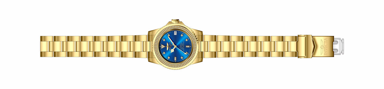 INVICTA Pro Diver Lady 36mm Stainless Steel Gold Blue dial NH35A Automatic , Band Material: Stainless Steel, Band Tone: Gold, Band Size [mm]: 18, Band Length [mm]: 190, Buckle Type: Fold over safety , Crown Type : Screw Down, Case Material : Stainless Steel, Case Tone : Gold, Case Size (mm) : 36, Case Back : Exhibition, Material of Hands : Metal, Color of Hands : Gold,Luminous, Crystal Type : Mineral, Bezel Material : Stainless Steel, Dial Material : Metal, Dial Color : Blue, Dial Pattern : Sun-ray Finish .Purchasing these parts and having a non-authorized repair center open your watch voids all manufacturing warranties. Invicta cannot guarantee the quality standards of an altered timepiece, the standard 3-year limited warranty on Invicta timepieces shall be invalid if the timepiece is serviced at any time by an unauthorized repair center. This includes battery replacements, which must be done at an Invicta authorized repair center in order to maintain the eligibility of the warranty. Please follow the link below to learn more about Invicta's warranty.https://cdn.invictawatch.com/www/files/invicta-warranty-2018.pdf