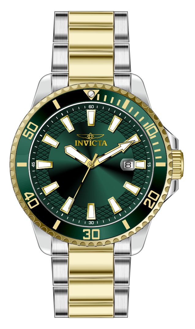 Band Material: Stainless Steel, Band Tone: Steel,Gold, Band Width: 22MM, Band Length: 191MM, Crown Type: Push, Case Material: Stainless Steel, Case Tone: Steel, Case Size [mm]: 45, Crystal Type: Flame Fusion, Dial Material: Brass, Dial Color: Green .Purchasing these parts and having a non-authorized repair center open your watch voids all manufacturing warranties. Invicta cannot guarantee the quality standards of an altered timepiece, the standard 3-year limited warranty on Invicta timepieces shall be invalid if the timepiece is serviced at any time by an unauthorized repair center. This includes battery replacements, which must be done at an Invicta authorized repair center in order to maintain the eligibility of the warranty. Please follow the link below to learn more about Invicta's warranty.https://cdn.invictawatch.com/www/files/invicta-warranty-2018.pdf