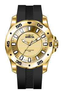 Band Material: Silicone, Band Tone: Black, Band Width: 26MM, Band Length: 210MM, Crown Type: Push, Case Material: Stainless Steel, Case Tone: Gold, Case Size [mm]: 50, Case Back: Solid, Material of Hands: Metal, Color of Hands: Gold, Crystal Type: Flame Fusion, Bezel Material: Stainless Steel,Aluminum, Dial Material: Metal, Dial Color: Gold, Dial Pattern: Textured Pattern .Purchasing these parts and having a non-authorized repair center open your watch voids all manufacturing warranties. Invicta cannot guarantee the quality standards of an altered timepiece, the standard 3-year limited warranty on Invicta timepieces shall be invalid if the timepiece is serviced at any time by an unauthorized repair center. This includes battery replacements, which must be done at an Invicta authorized repair center in order to maintain the eligibility of the warranty. Please follow the link below to learn more about Invicta's warranty.https://cdn.invictawatch.com/www/files/invicta-warranty-2018.pdf