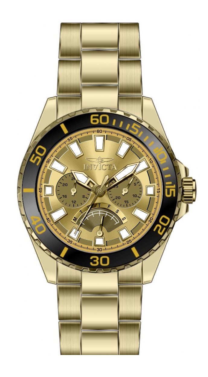 Band Material: Stainless Steel, Band Tone: Gold, Band Width: 24MM, Band Length: 185MM, Crown Type: Push, Case Material: Stainless Steel, Case Tone: Gold, Case Size [mm]: 46, Crystal Type: Flame Fusion, Dial Material: Brass, Dial Color: Gold .Purchasing these parts and having a non-authorized repair center open your watch voids all manufacturing warranties. Invicta cannot guarantee the quality standards of an altered timepiece, the standard 3-year limited warranty on Invicta timepieces shall be invalid if the timepiece is serviced at any time by an unauthorized repair center. This includes battery replacements, which must be done at an Invicta authorized repair center in order to maintain the eligibility of the warranty. Please follow the link below to learn more about Invicta's warranty.https://cdn.invictawatch.com/www/files/invicta-warranty-2018.pdf