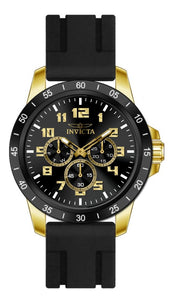 Band Material: Silicone, Band Tone: Black, Band Width: 22MM, Band Length: 220MM, Crown Type: Push, Case Material: Stainless Steel, Case Tone: Gold, Case Size [mm]: 45, Case Back: Solid, Material of Hands: Brass, Color of Hands: Gold,Luminous, Crystal Type: Mineral, Bezel Material: Stainless Steel, Dial Material: Brass, Dial Color: Black, Dial Pattern: Sun-ray Finish .Purchasing these parts and having a non-authorized repair center open your watch voids all manufacturing warranties. Invicta cannot guarantee the quality standards of an altered timepiece, the standard 3-year limited warranty on Invicta timepieces shall be invalid if the timepiece is serviced at any time by an unauthorized repair center. This includes battery replacements, which must be done at an Invicta authorized repair center in order to maintain the eligibility of the warranty. Please follow the link below to learn more about Invicta's warranty.https://cdn.invictawatch.com/www/files/invicta-warranty-2018.pdf