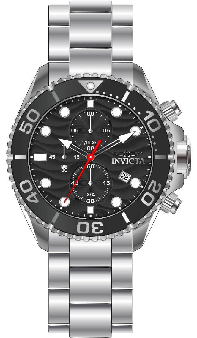 Band Material: iSize Stainless Steel, Band Tone: Silver, Band Width: 24MM, Band Length: 175MM, Crown Type: Push, Case Material: Stainless Steel, Case Tone: Silver, Case Size [mm]: 53.3, Crystal Type: Mineral, Dial Material: Brass, Dial Color: Black .Purchasing these parts and having a non-authorized repair center open your watch voids all manufacturing warranties. Invicta cannot guarantee the quality standards of an altered timepiece, the standard 3-year limited warranty on Invicta timepieces shall be invalid if the timepiece is serviced at any time by an unauthorized repair center. This includes battery replacements, which must be done at an Invicta authorized repair center in order to maintain the eligibility of the warranty. Please follow the link below to learn more about Invicta's warranty.https://cdn.invictawatch.com/www/files/invicta-warranty-2018.pdf