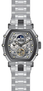 Band Material: Stainless Steel, Band Tone: Steel,Black, Band Width: 30.6MM, Band Length: 210MM, Buckle Type: Fold over safety, Clasp Type: Safety,Deployment, Crown Type : Screw Down, Case Material : Stainless Steel, Case Tone : Black,Steel, Case Size [mm] : 52.5, Case Back : Solid, Material of Hands : Metal, Color of Hands : Luminous,Gunmetal, Crystal Type : Flame Fusion, Bezel Material : Stainless Steel, Dial Material : Metal,Skeleton, Dial Color : Silver, Dial Pattern : None .Purchasing these parts and having a non-authorized repair center open your watch voids all manufacturing warranties. Invicta cannot guarantee the quality standards of an altered timepiece, the standard 3-year limited warranty on Invicta timepieces shall be invalid if the timepiece is serviced at any time by an unauthorized repair center. This includes battery replacements, which must be done at an Invicta authorized repair center in order to maintain the eligibility of the warranty. Please follow the link below to learn more about Invicta's warranty.https://cdn.invictawatch.com/www/files/invicta-warranty-2018.pdf