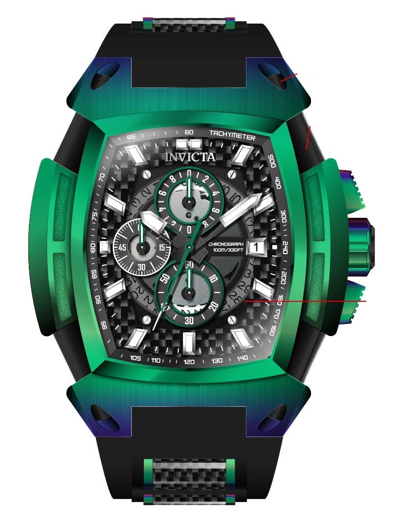 INVICTA S1 Rally Men 53mm Stainless Steel + Aluminum Black + Iridescent Black dial VD57 Quartz , Band Material: Silicone,Carbon Fiber, Band Tone: Black,Iridescent, Band Size [mm]: 31, Band Length [mm]: 210, Buckle Type: Buckle , Crown Type : Push, Case Material : Stainless Steel,Aluminum, Case Tone : Black,Iridescent, Case Size (mm) : 53, Case Back : Solid, Material of Hands : Metal, Color of Hands : Black,White,Green, Crystal Type : Flame Fusion, Bezel Material : Stainless Steel, Dial Material : Metal,Carbon Fiber, Dial Color : Black .Purchasing these parts and having a non-authorized repair center open your watch voids all manufacturing warranties. Invicta cannot guarantee the quality standards of an altered timepiece, the standard 3-year limited warranty on Invicta timepieces shall be invalid if the timepiece is serviced at any time by an unauthorized repair center. This includes battery replacements, which must be done at an Invicta authorized repair center in order to maintain the eligibility of the warranty. Please follow the link below to learn more about Invicta's warranty.https://cdn.invictawatch.com/www/files/invicta-warranty-2018.pdf