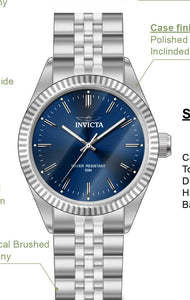 Band Material: Stainless Steel, Band Tone: Steel, Band Width: 18MM, Band Length: 195MM, Crown Type: Push, Case Material: Stainless Steel, Case Tone: Steel, Case Size [mm]: 36, Crystal Type: Mineral, Dial Material: Brass, Dial Color: Blue .Purchasing these parts and having a non-authorized repair center open your watch voids all manufacturing warranties. Invicta cannot guarantee the quality standards of an altered timepiece, the standard 3-year limited warranty on Invicta timepieces shall be invalid if the timepiece is serviced at any time by an unauthorized repair center. This includes battery replacements, which must be done at an Invicta authorized repair center in order to maintain the eligibility of the warranty. Please follow the link below to learn more about Invicta's warranty.https://cdn.invictawatch.com/www/files/invicta-warranty-2018.pdf