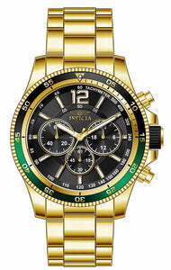 Band Material: Stainless Steel, Band Tone: Gold, Band Width: 22MM, Band Length: 182.5MM, Crown Type: Push, Case Material: Stainless Steel, Case Tone: Gold, Case Size [mm]: 45, Case Back: Solid, Material of Hands: Metal, Color of Hands: Gold, Crystal Type: Flame Fusion, Bezel Material: Stainless Steel,Aluminum, Dial Material: Metal, Dial Color: Black, Dial Pattern: None .Purchasing these parts and having a non-authorized repair center open your watch voids all manufacturing warranties. Invicta cannot guarantee the quality standards of an altered timepiece, the standard 3-year limited warranty on Invicta timepieces shall be invalid if the timepiece is serviced at any time by an unauthorized repair center. This includes battery replacements, which must be done at an Invicta authorized repair center in order to maintain the eligibility of the warranty. Please follow the link below to learn more about Invicta's warranty.https://cdn.invictawatch.com/www/files/invicta-warranty-2018.pdf